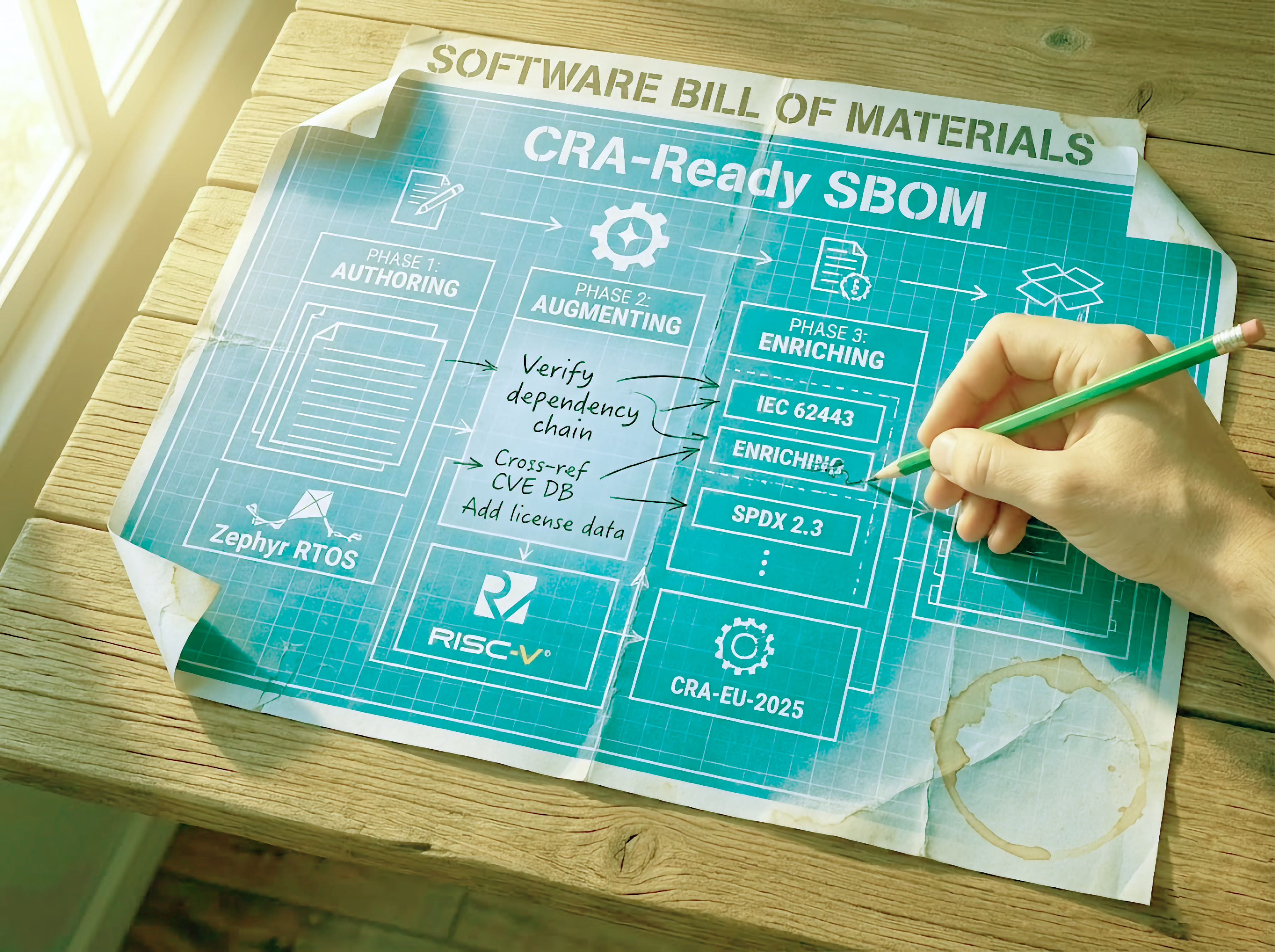 2. The SBOM compliance stack: CRA-Ready SBOM blueprint [7] provides the four-phase pipeline with GitHub Actions implementation. Zephyr RTOS case study [6] covers embedded firmware specifically. pkgconf [5] closes the C/C++ build-time gap.